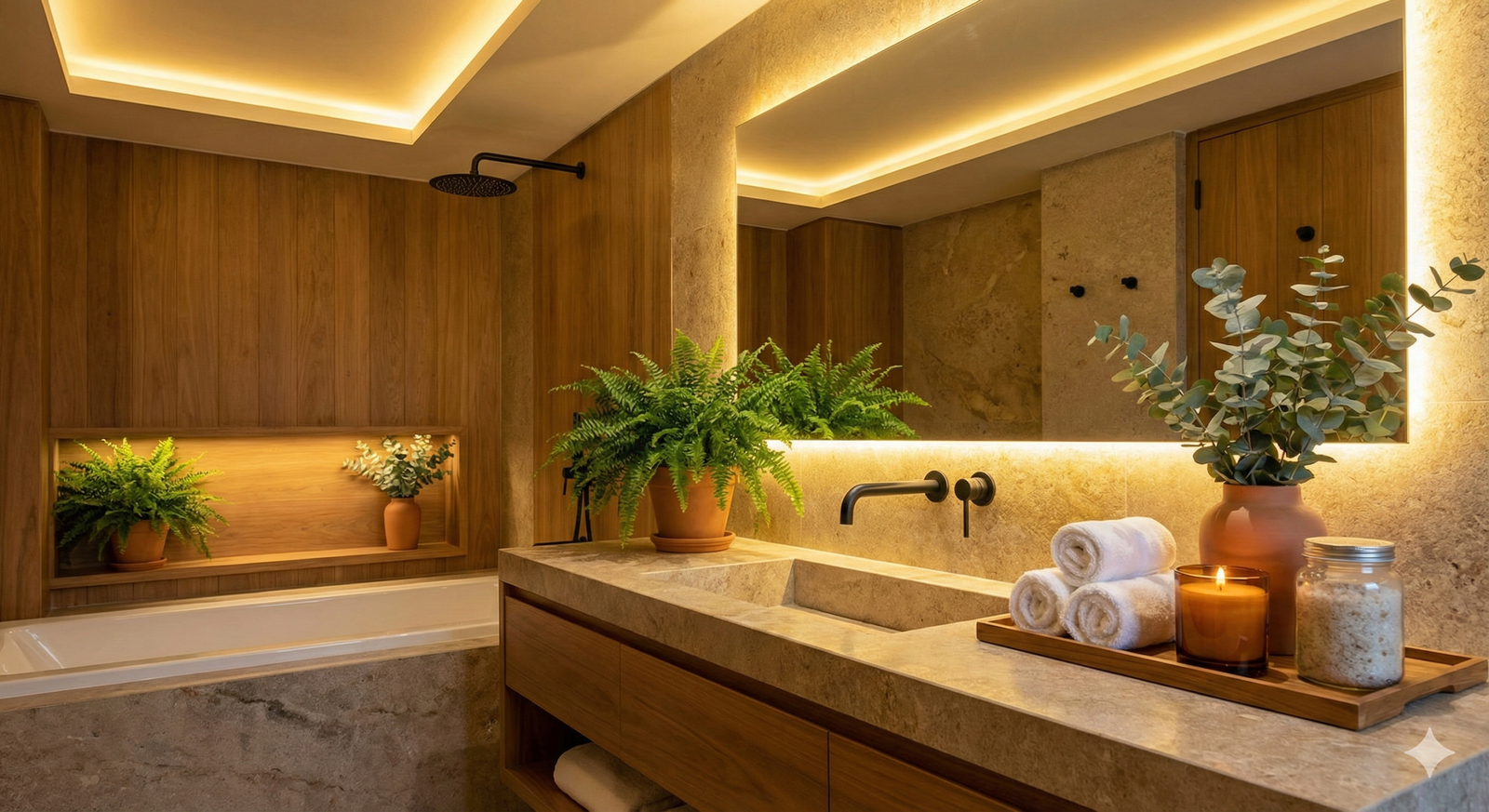 A luz branca fria (6000K) é ótima para hospitais, mas terrível para relaxar. Ela deixa o banheiro com cara de lavanderia. Para o efeito Spa, a regra é clara: Luz Quente (3000K) e Indireta. Troque a lâmpada principal. Instale uma fita de LED atrás do espelho (retroiluminação) ou use arandelas ao lado da bancada. A luz difusa esconde imperfeições da pele e cria instantaneamente a sensação de calma e sofisticação.
