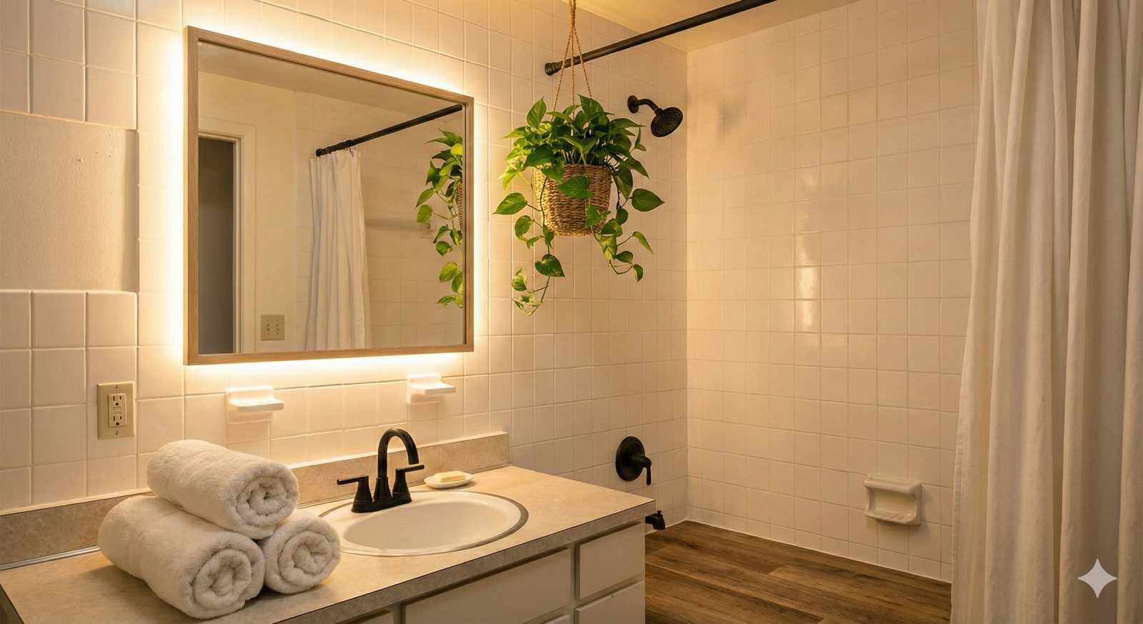 A luz branca fria (6000K) é ótima para hospitais, mas terrível para relaxar. Ela deixa o banheiro com cara de lavanderia. Para o efeito Spa, a regra é clara: Luz Quente (3000K) e Indireta. Troque a lâmpada principal. Instale uma fita de LED atrás do espelho (retroiluminação) ou use arandelas ao lado da bancada. A luz difusa esconde imperfeições da pele e cria instantaneamente a sensação de calma e sofisticação.
