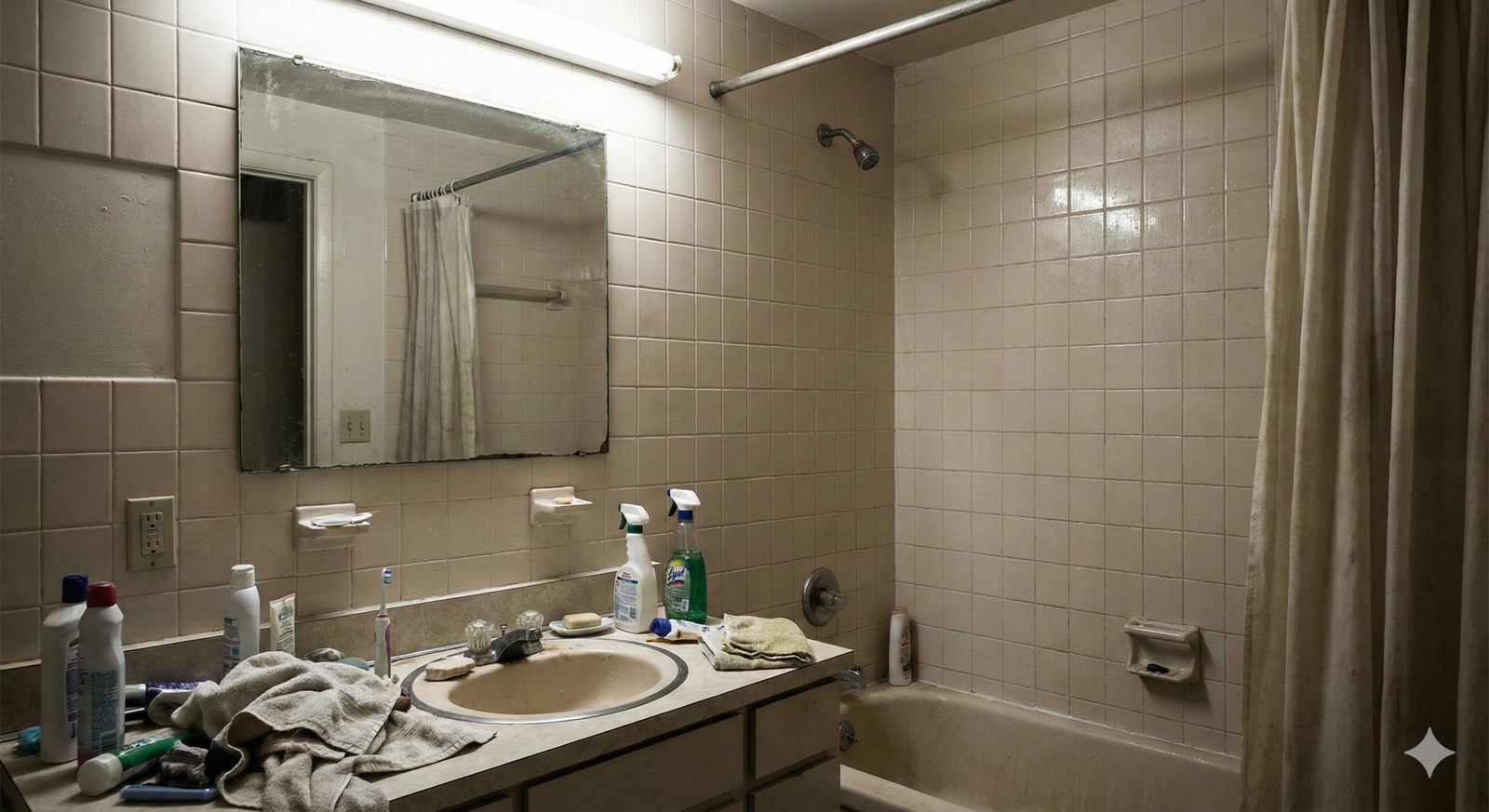 O poder da Reforma Seca. À esquerda, o banheiro original frio e datado. À direita, o mesmo espaço renovado com pintura epóxi nos azulejos, espelho com LED, metais pretos e plantas. Custo estimado: 10% de uma reforma tradicional.