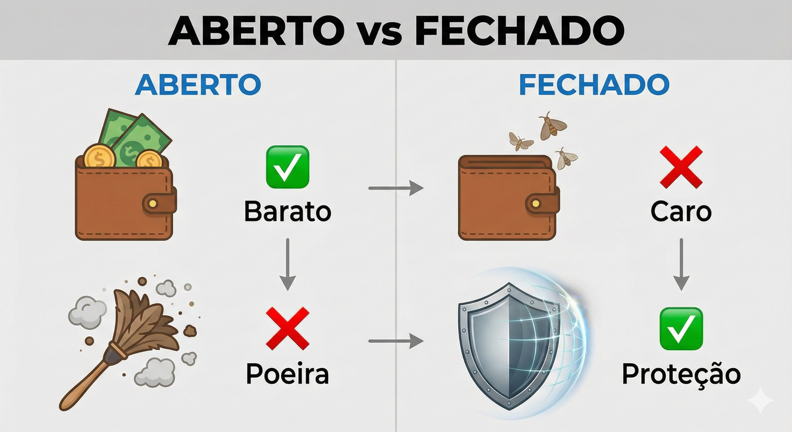 O Duelo do Design. Lado Esquerdo (Aberto/Industrial): Custo Baixo ($), Manutenção Alta (Limpeza diária), Estilo Despojado. Lado Direito (Fechado/MDF): Custo Alto ($$$$), Manutenção Baixa (Proteção total), Estilo Clean.