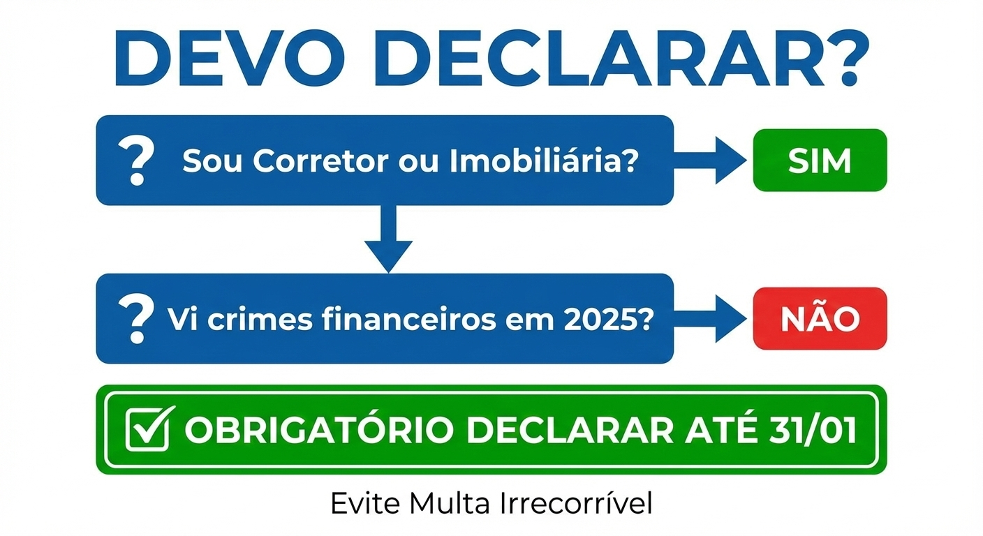 Muitos corretores, especialmente os autônomos ou recém-formados, ignoram essa exigência por acharem que “só quem vendeu mansões de milhões precisa declarar”. Esse é um erro fatal. A Lei de Lavagem de Dinheiro (Lei 9.613/98) obriga todos os inscritos no CRECI (Pessoa Física e Jurídica) a informar ao governo se viram ou não alguma movimentação suspeita no ano anterior.